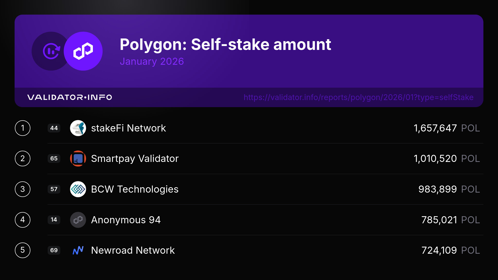 These are the top 5 Polygon validators ranked by self-stake amount as of February 1, 26: