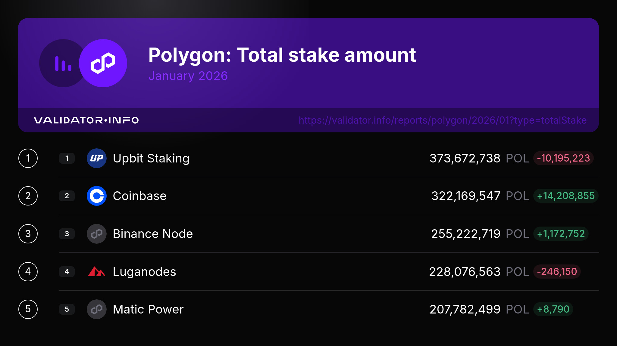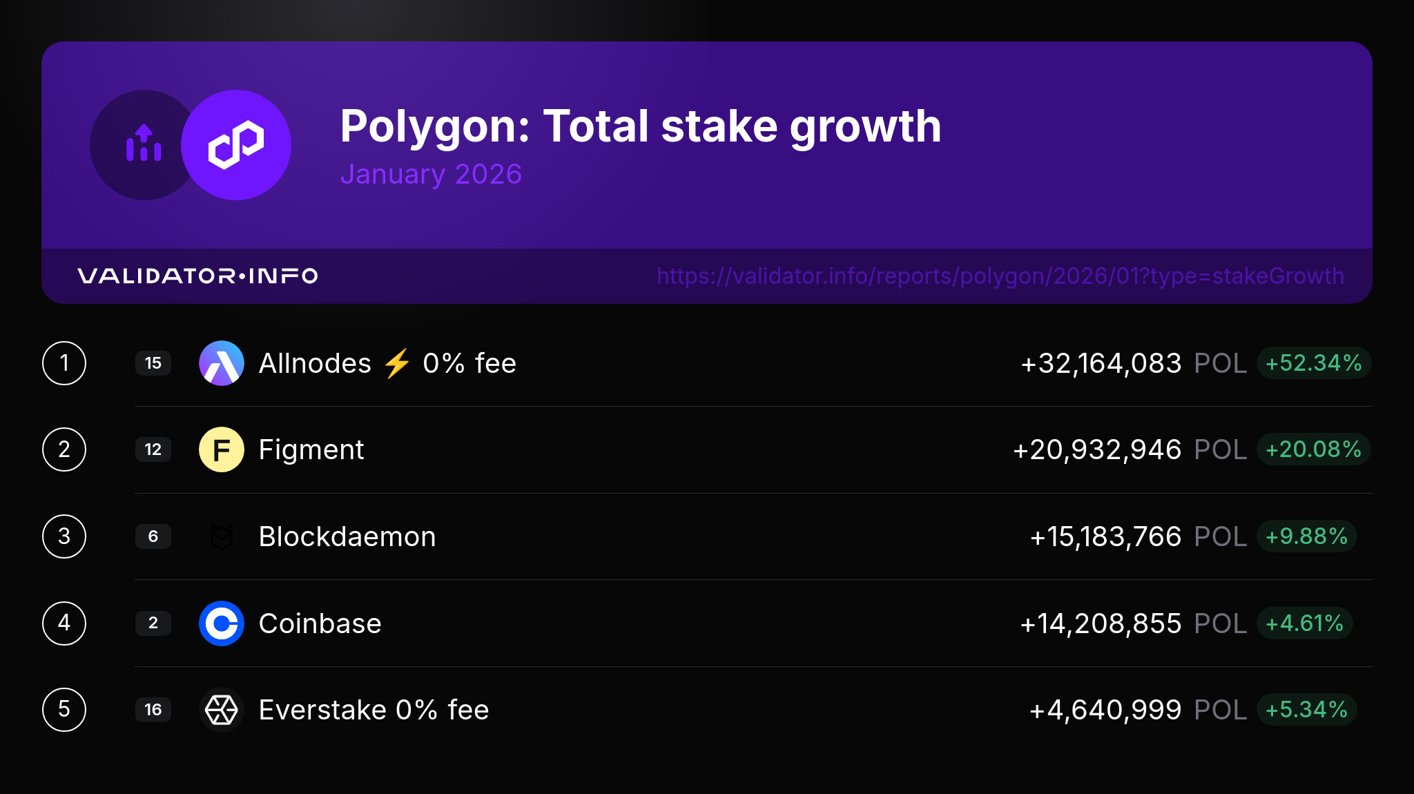We’re thrilled to announce the top 5 Polygon validators who experienced the biggest stake increase in the past month! Congratulations to them: