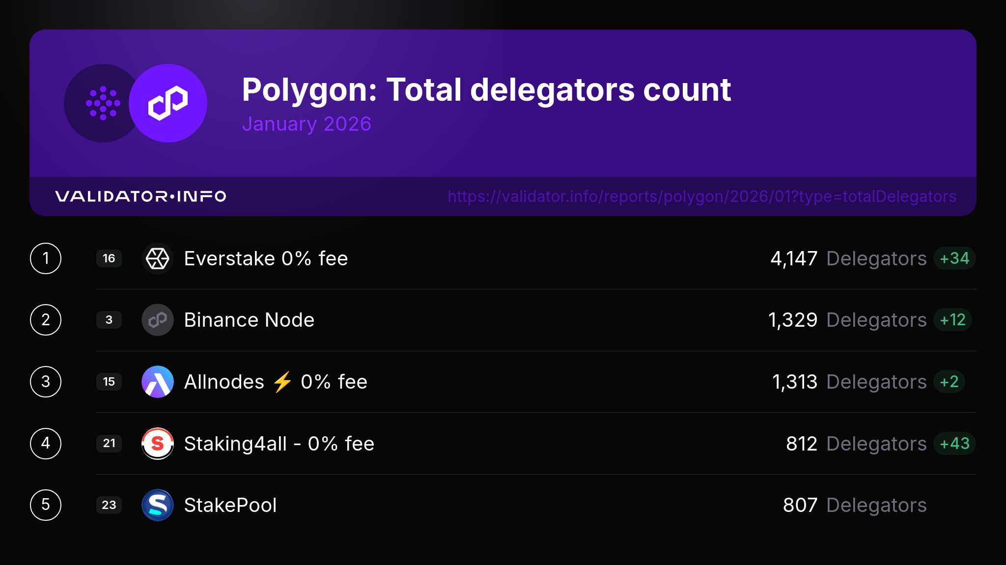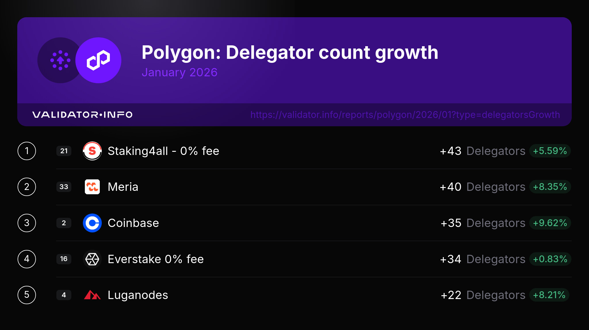 Let’s also give congrats to the top 5 Polygon validators who increased their delegator count the most during the past month:
