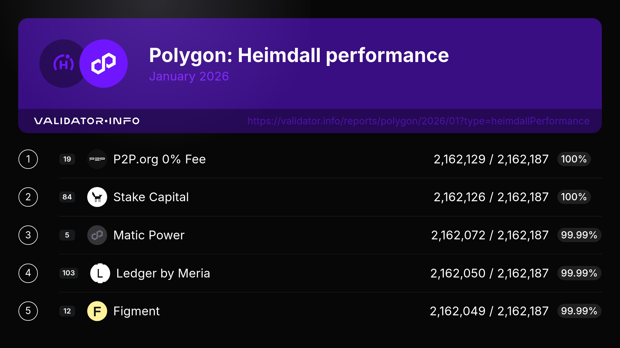Here are the top 5 Polygon validators with the best Heimdall performance in the last month.
