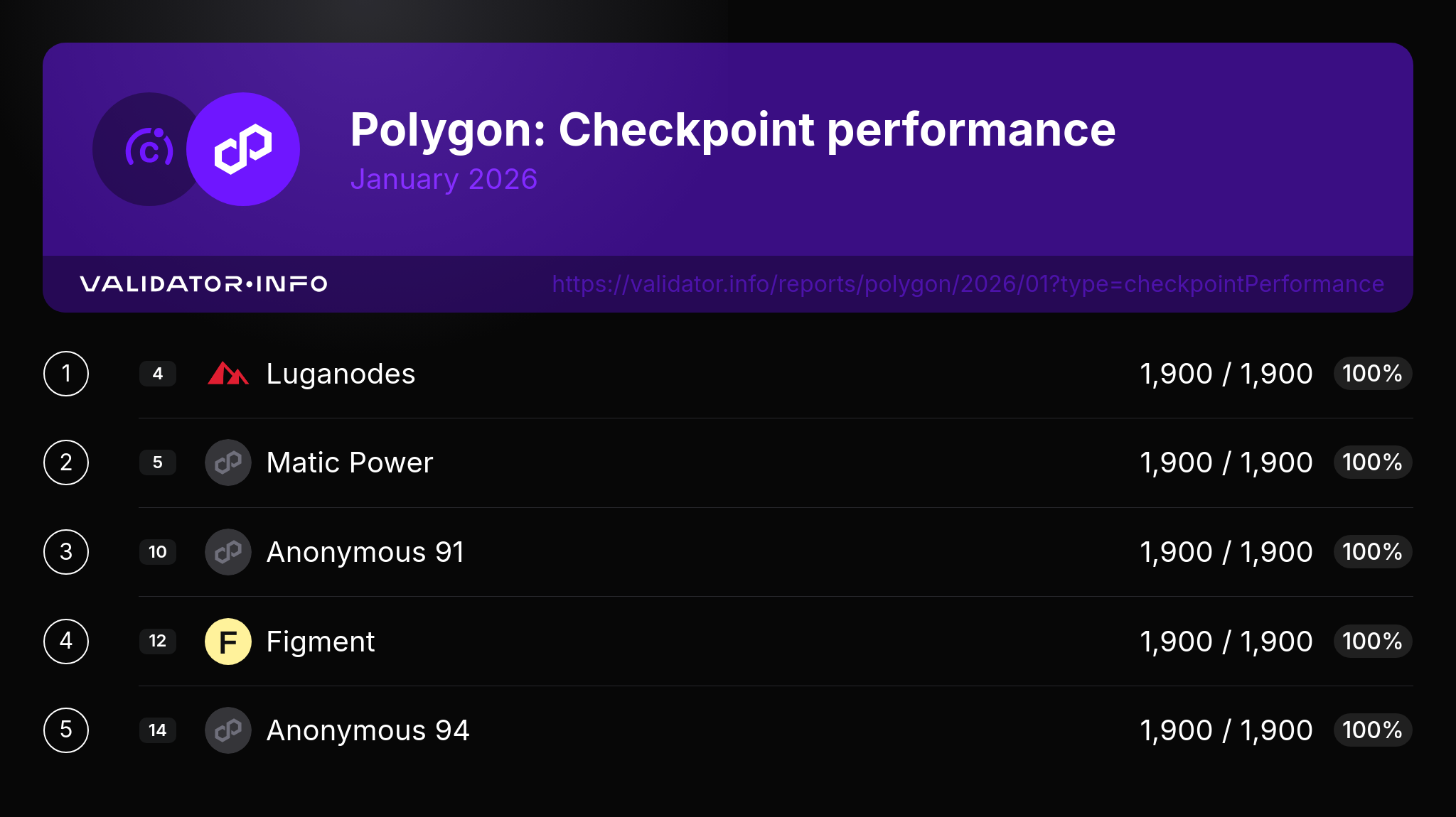 Here are the top 5 Polygon validators with the best Checkpoint performance in the last month.