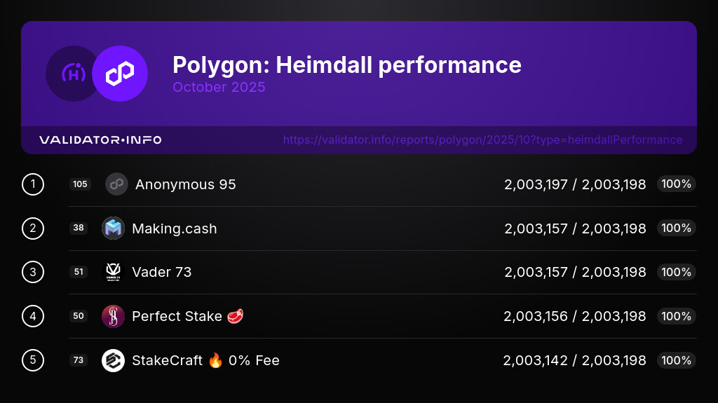 Here are the top 5 Polygon validators with the best Heimdall performance in the last month.