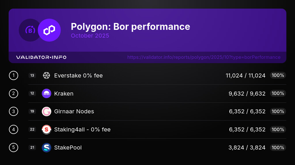 Lastly, these are the top 5 Polygon validators with the best Bor performance in the last month.