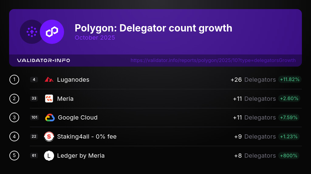 Let’s also give congrats to the top 5 Polygon validators who increased their delegator count the most during the past month: