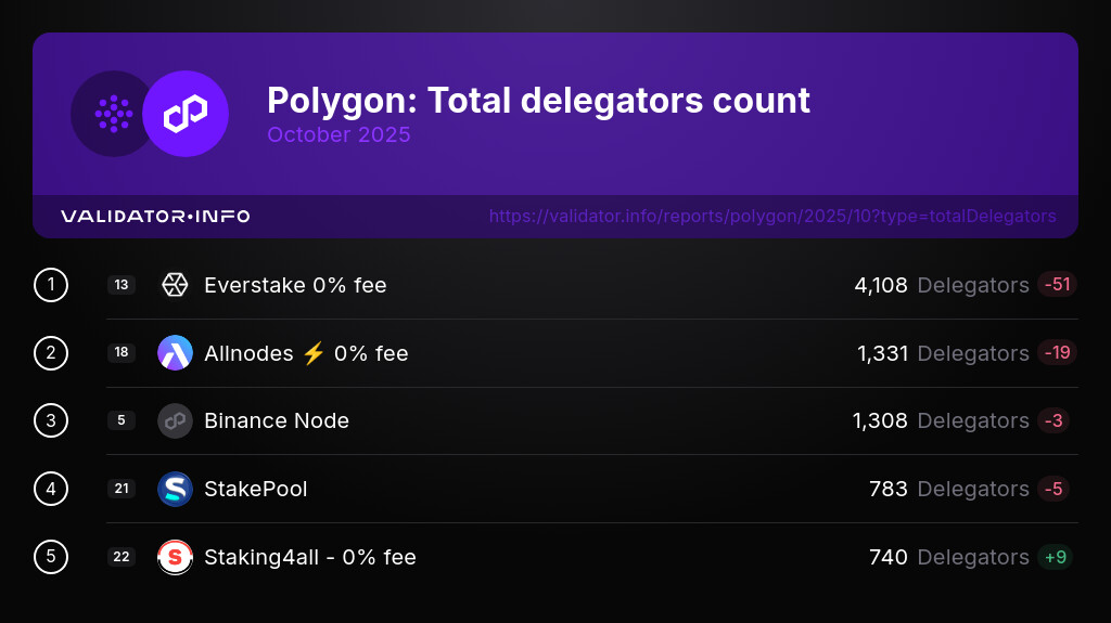 Here are the top 5 Polygon validators ranked by total delegators number as of November 1, 25.