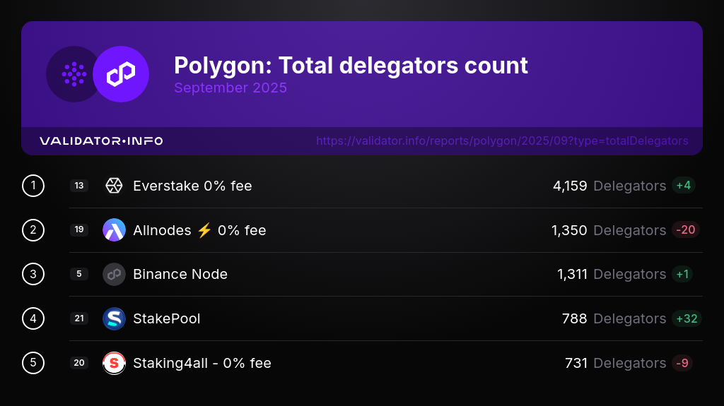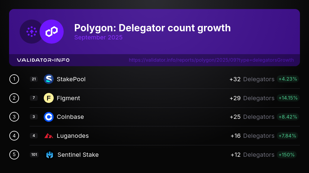 Let’s also give congrats to the top 5 Polygon validators who increased their delegator count the most during the past month: