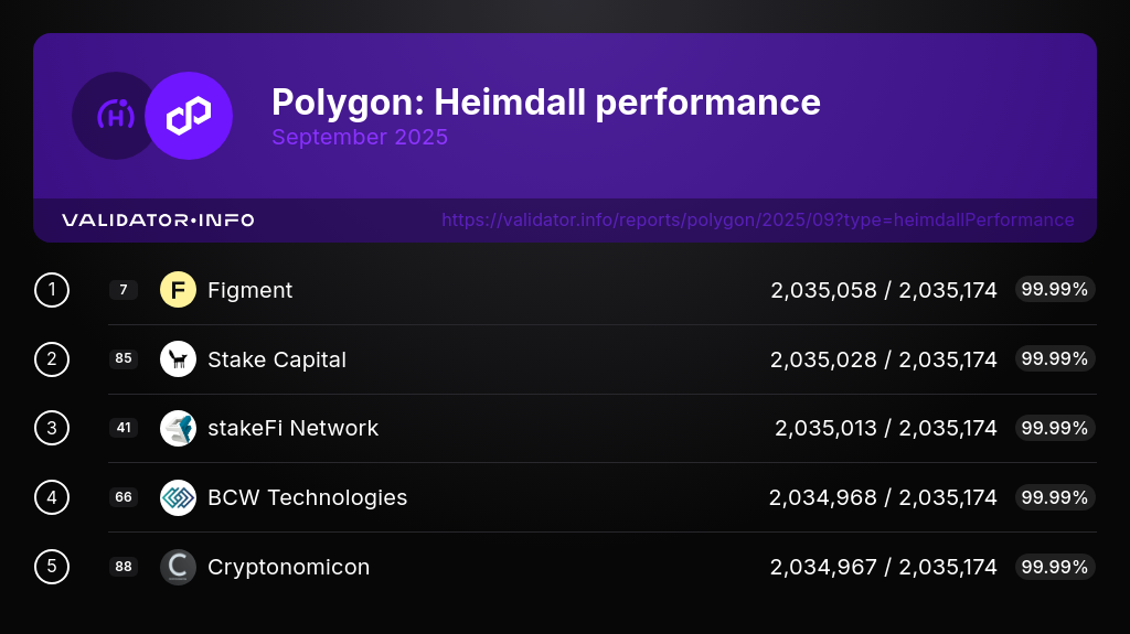 Here are the top 5 Polygon validators with the best Heimdall performance in the last month.