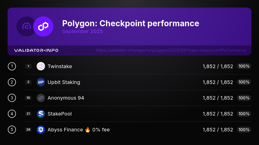 Here are the top 5 Polygon validators with the best Checkpoint performance in the last month.