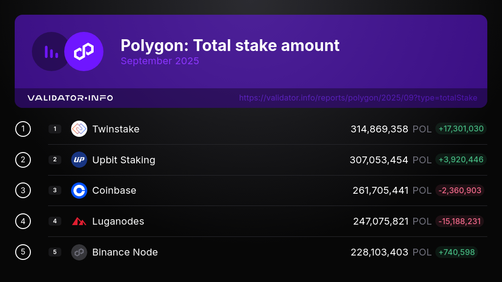Here are the top 5 Polygon validators ranked by total stake as of October 1, 25: