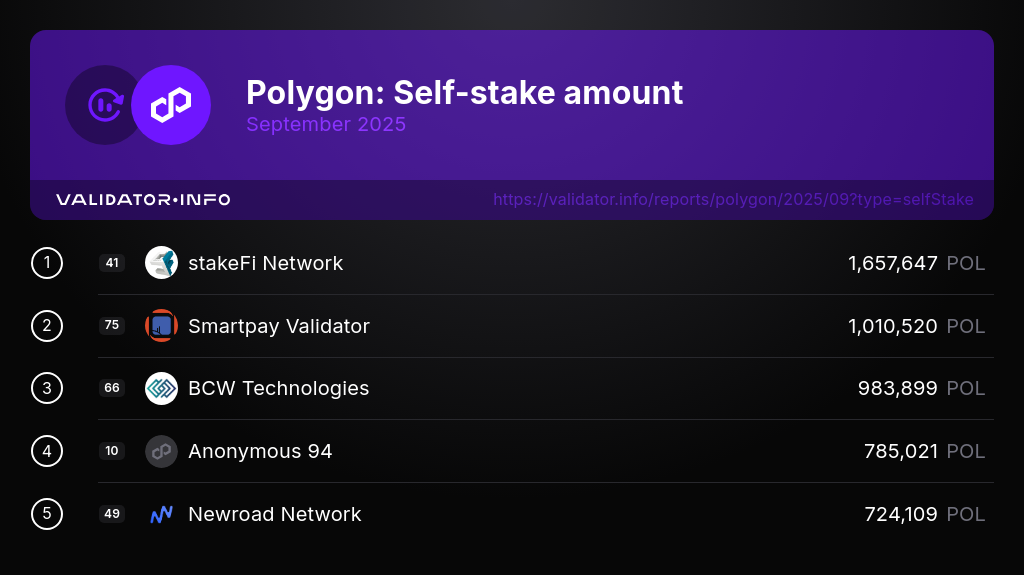 These are the top 5 Polygon validators ranked by self-stake amount as of October 1, 25: