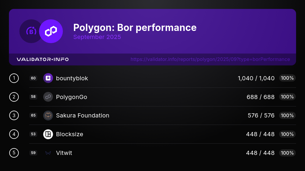 Lastly, these are the top 5 Polygon validators with the best Bor performance in the last month.